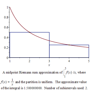 \int^5_1 \, \frac{\textrm{d} x}{x} \, \, \approx \, \, \frac{5-1}{2}\left( \frac{1}{2} \, + \, \frac{1}{4} \right)